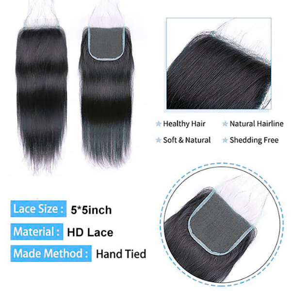 Our 5x5 HD Lace Closure is the go-to choice for a flawless, natural finish with minimal effort. Featuring a 5-inch width and 5-inch deep parting space, it gives you more styling flexibility than traditional closures while maintaining an easy, low-maintenance install. The ultra-thin HD lace melts seamlessly into any skin tone, creating an undetectable hairline and a true scalp illusion. Made from 100% virgin human hair, it’s soft, tangle-free, and built to withstand bleaching, coloring, and heat styling without shedding or damage. Whether you're going for a sleek middle part or a side part, this closure lays flat and blends perfectly with bundles or wigs. Available in a range of textures like straight, body wave, and deep wave.